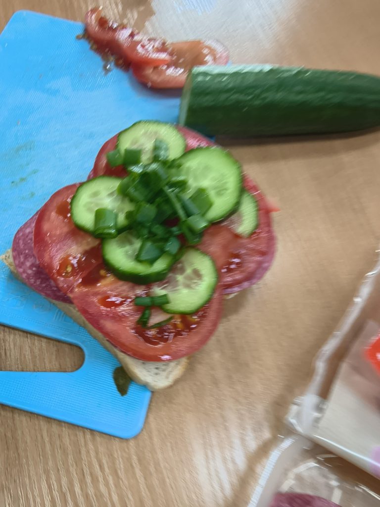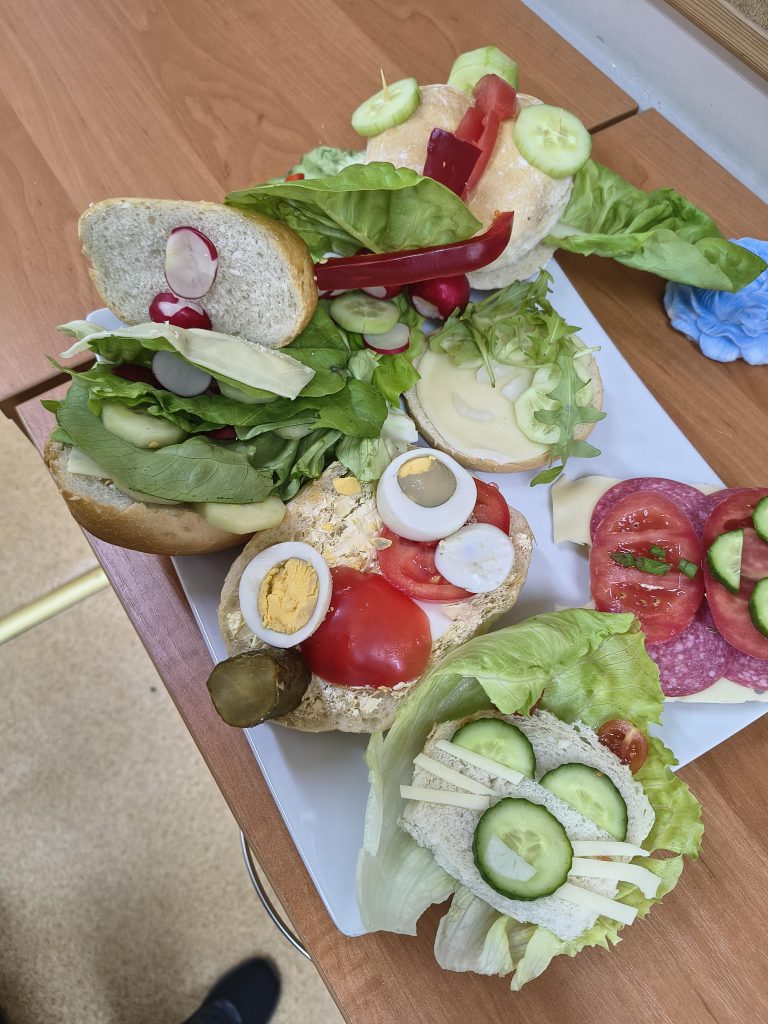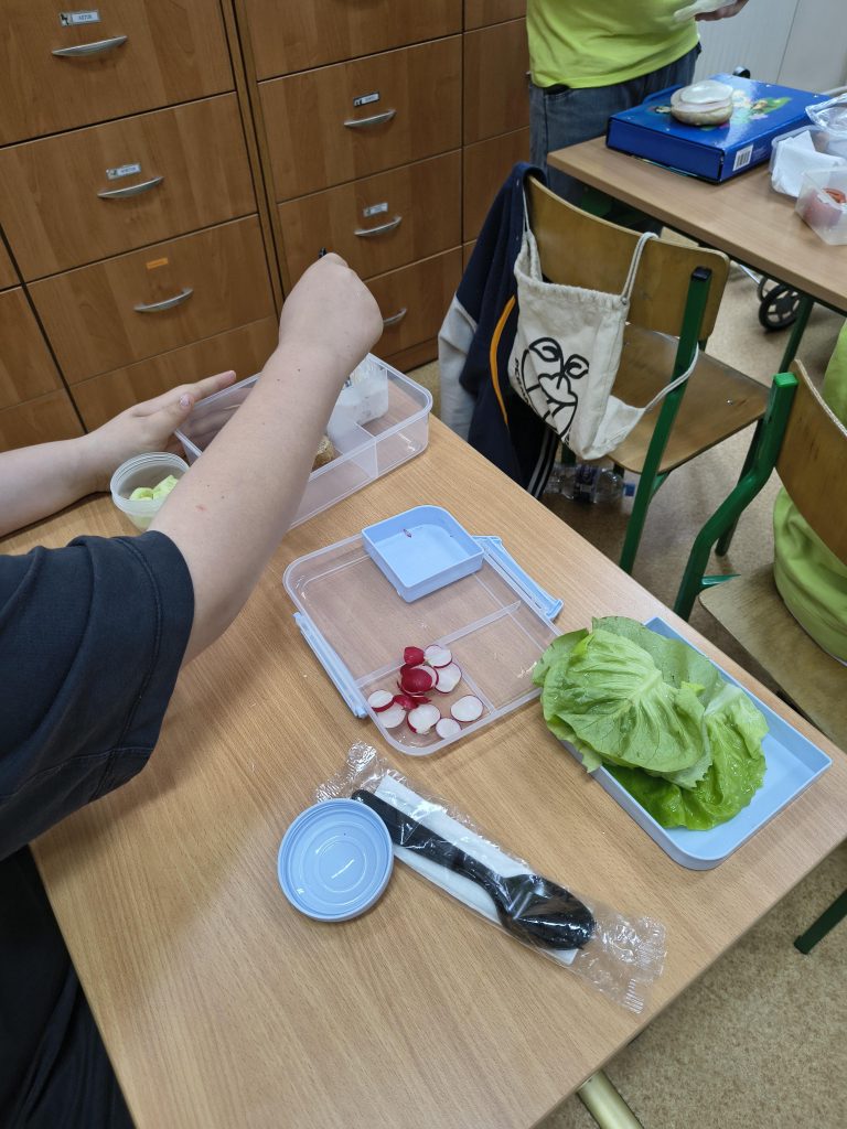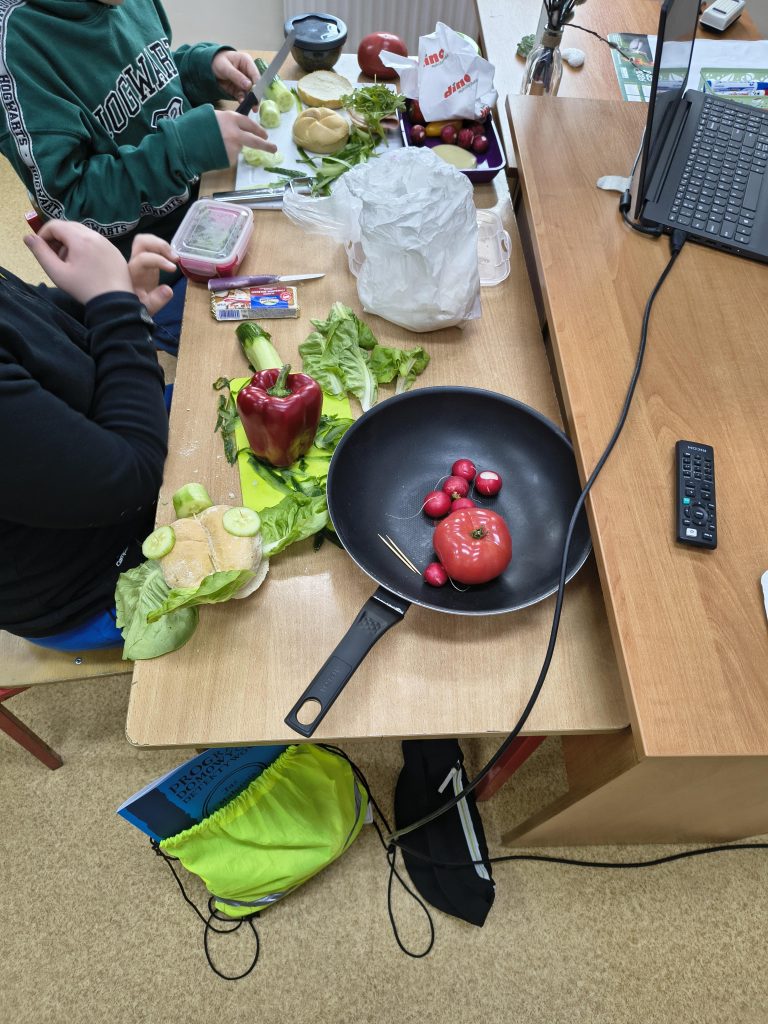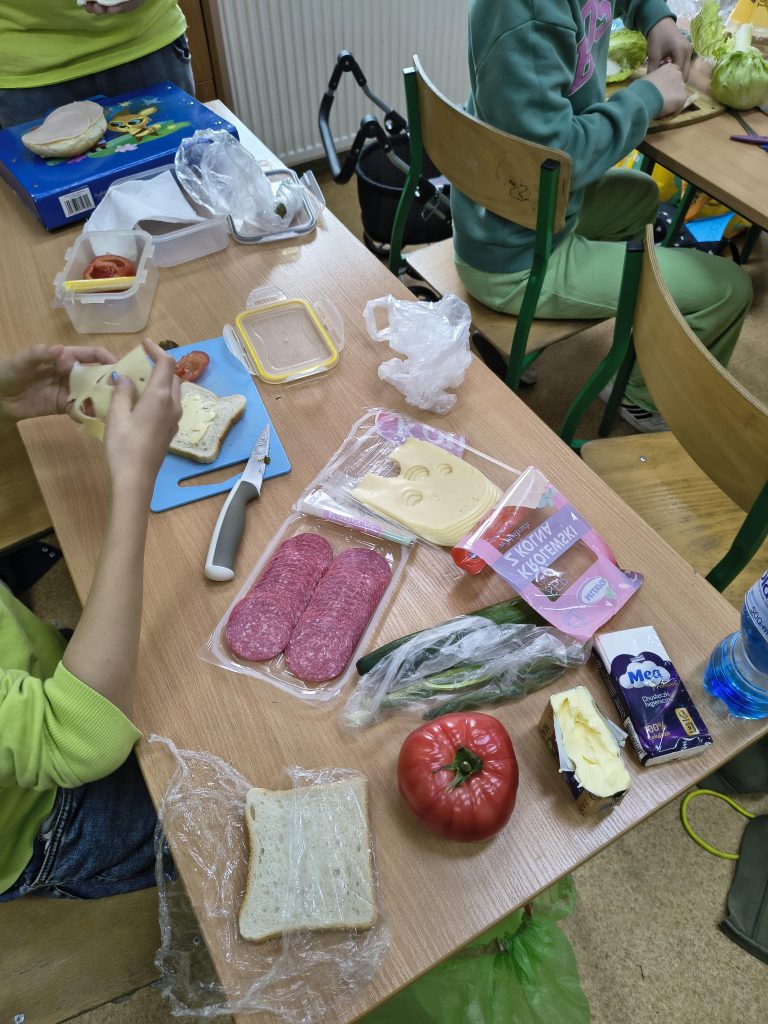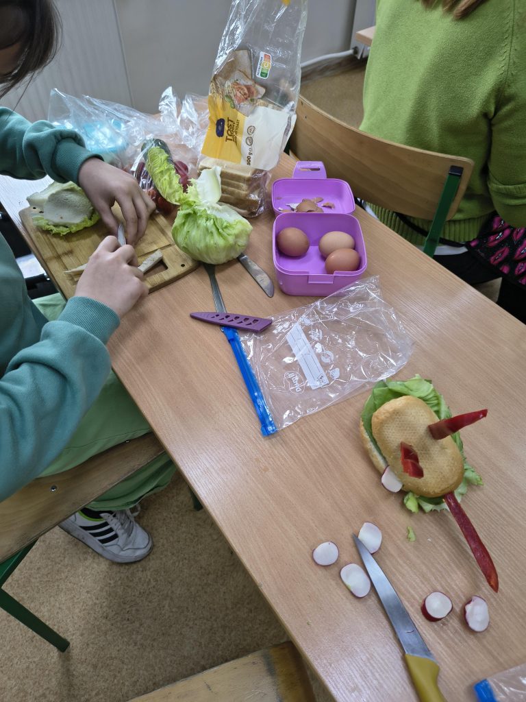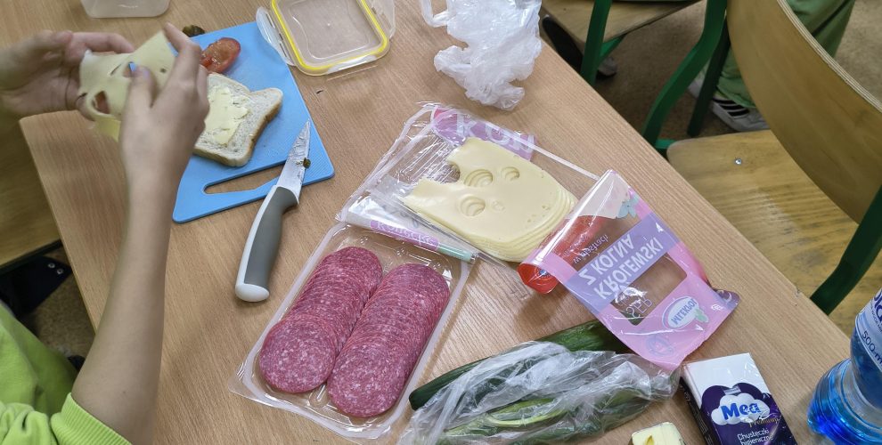 W ramach projektu uczniowie mieli wiosenne zajęcia praktyczne w postaci przygotowania, a następnie spożycia drugiego śniadania. Niewątpliwie drugie śniadanie, które uczniowie powinni jeść w szkole, jest bardzo ważnym posiłkiem w ciągu dnia. Kanapki przygotowane przez uczniów były różnorodne, składające się ze zdrowych produktów, a przede wszystkim smaczne.