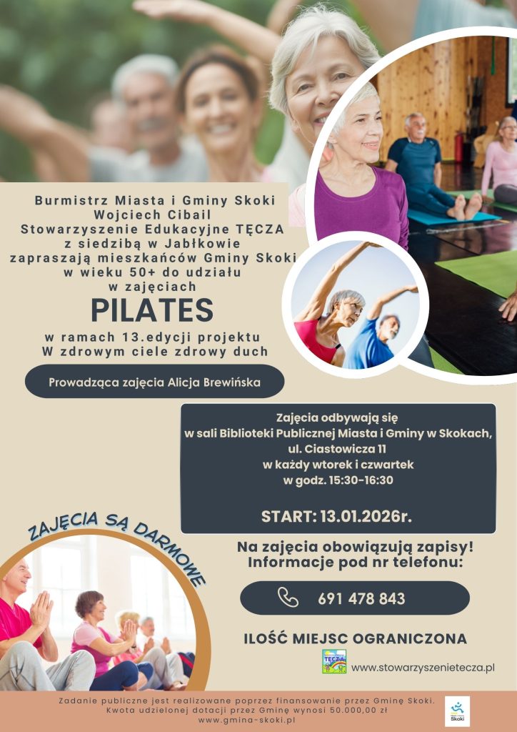 Burmistrz Miasta i Gminy Skoki Wojciech Cibail oraz Stowarzyszenie Edukacyjne TĘCZA z siedzibą w Jabłkowie zapraszają mieszkańców Gminy Skoki w wieku 50+ do udziału w bezpłatnych zajęciach PILATES, realizowanych w ramach 13. edycji projektu W zdrowym ciele zdrowy duch.