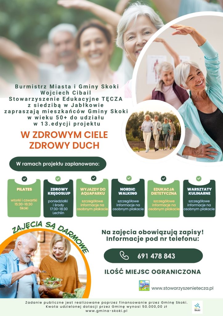 Burmistrz Miasta i Gminy Skoki Wojciech Cibail oraz Stowarzyszenie Edukacyjne TĘCZA zapraszają mieszkańców Gminy Skoki w wieku 50+ do udziału w bezpłatnych zajęciach prozdrowotnych i aktywizujących.