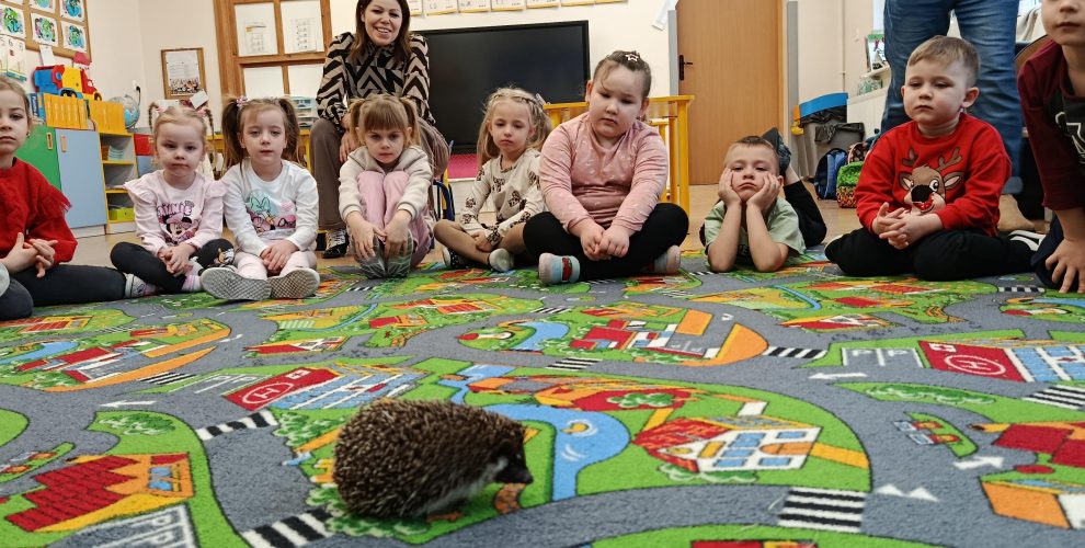 Przedszkolaki dowiedziały się wiele ciekawostek o przybyłych zwierzętach, uczestniczyły w kamieniu agam, które ze smakiem zajadały drewnojady, przyglądały się skórą węży oraz pająka oraz kolcom jeżozwierza.