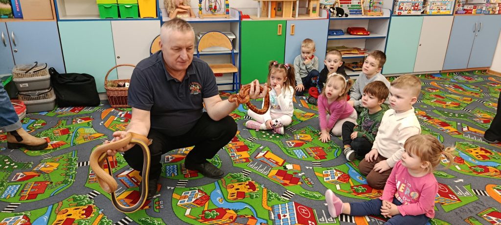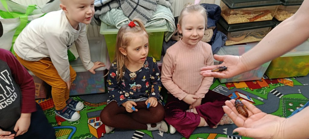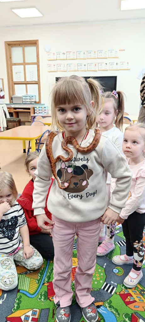 Przedszkolaki pod okiem opiekunów z radością zostały wprowadzone w świat zwierząt. Mogły obserwować oraz dotknąć: króliczki miniaturki, kogutka serama, jeżyka afrykańskiego, agamy brodate, gekona lamparciego, węża jaskiniowego i zbożowego, ptasznika olbrzymiego oraz pomarańczowokolanowego, ślimaka afrykańskiego, karaczany z Madagaskaru i wija kenijskiego.